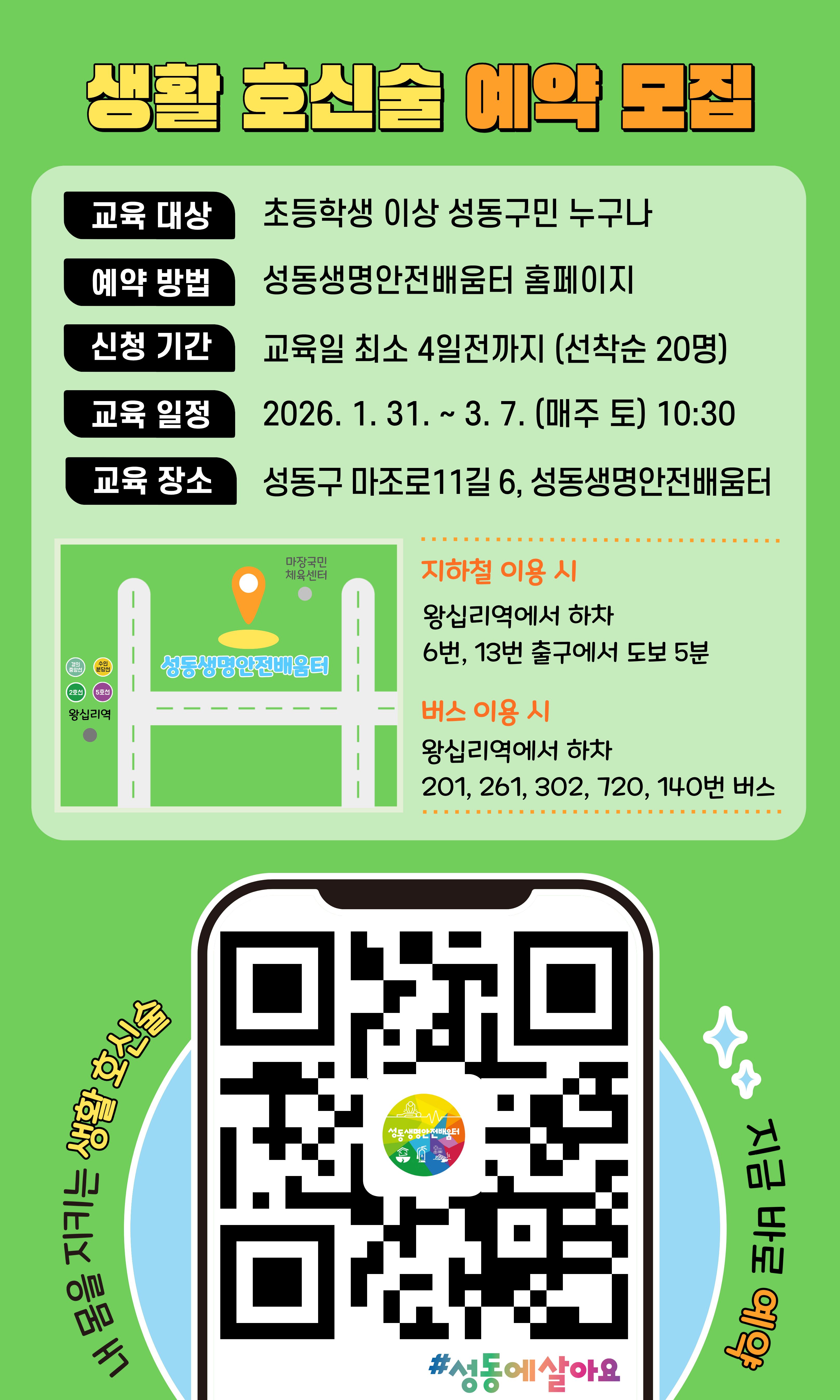 이번 교육은 성동생명안전배움터(성동구 마조로 11길 6)에서 1월 31일부터 3월 7일까지 매주 토요일 10시 30분에 진행한다. 교육 대상은 초등학생 이상 성동구민이며, 가족 단위 신청도 가능하다. 매회 20명 내외 선착순 모집으로 첫 번째 교육은 1월 19일부터 신청받는다.